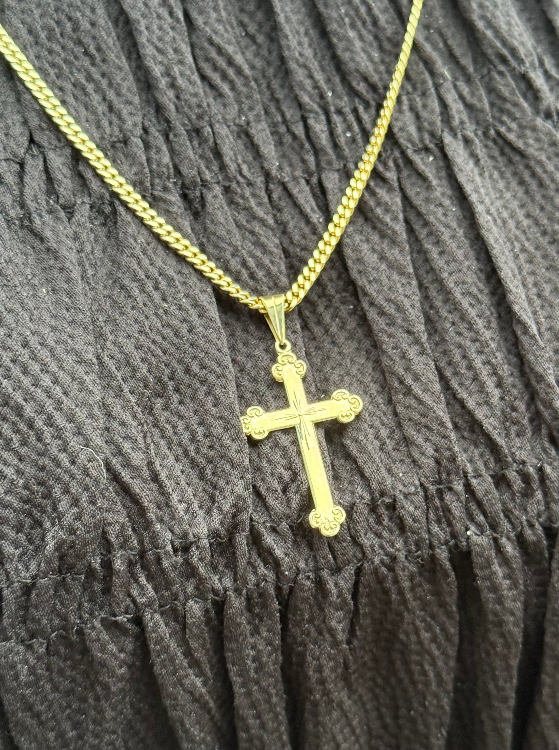 Et flott og stort kors i 585 gull med nydelig dekor på kantene. Trekanthempe.